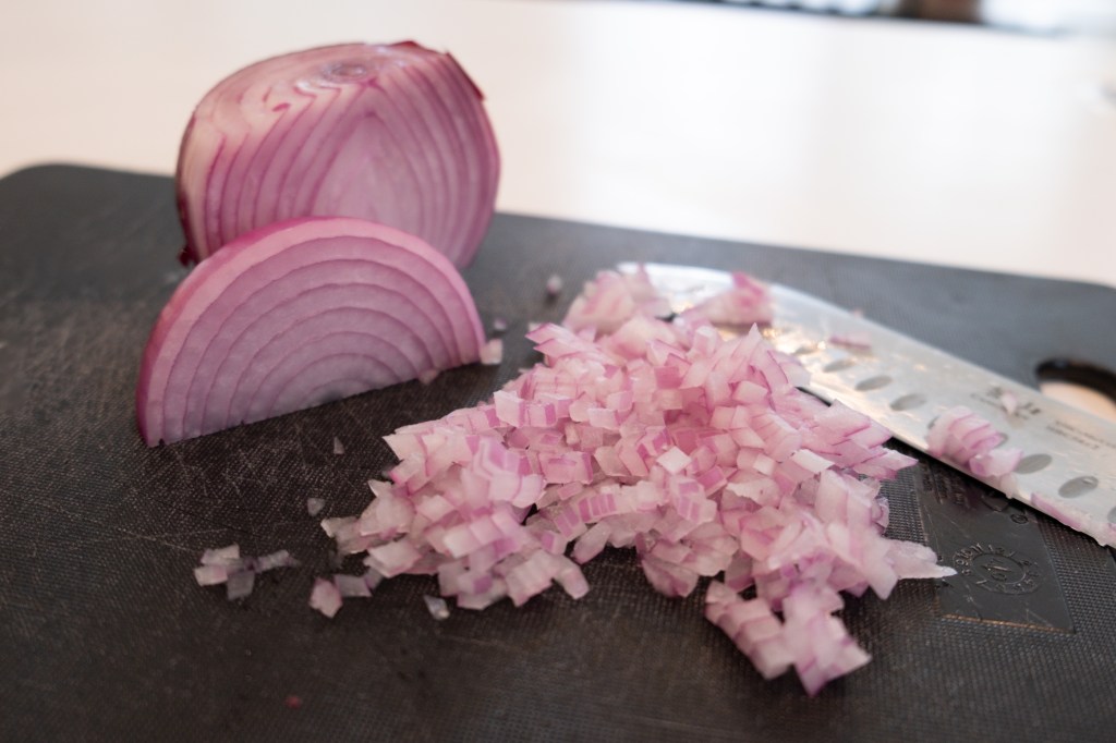 Next dice up your red onion, small. You don’t want a big bite of raw onion overpowering your bite. You’ll soak this onion in a bowl of cold water in order mellow out the flavor so the raw onion flavor doesn’t overtake the dish.