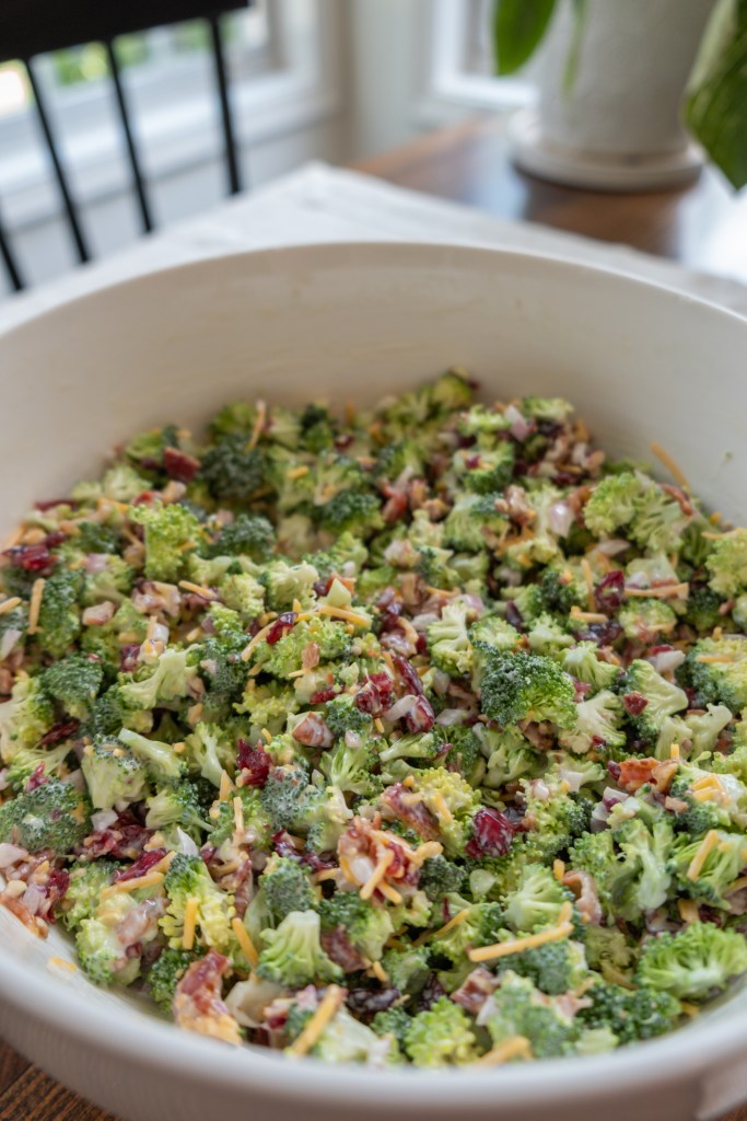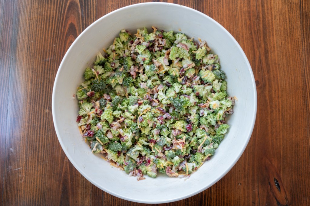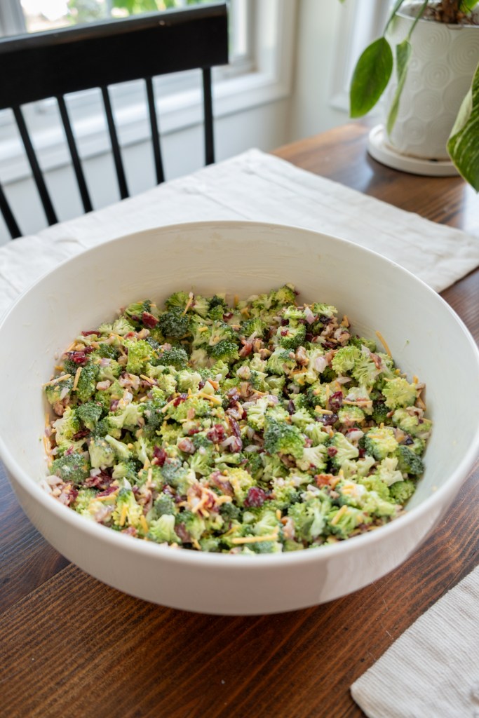 Once your broccoli is all chopped up, add it to your serving bowl. Chop up your pecans, bacon, and cranberries and toss those in. Add some shredded cheese (you can fresh shred it yourself, but this is the one recipe where I can honestly say I don’t think it makes a difference). Dry the red onion and add it in. Pour the dressing you made earlier over all of it and stir until everything is well mixed up.